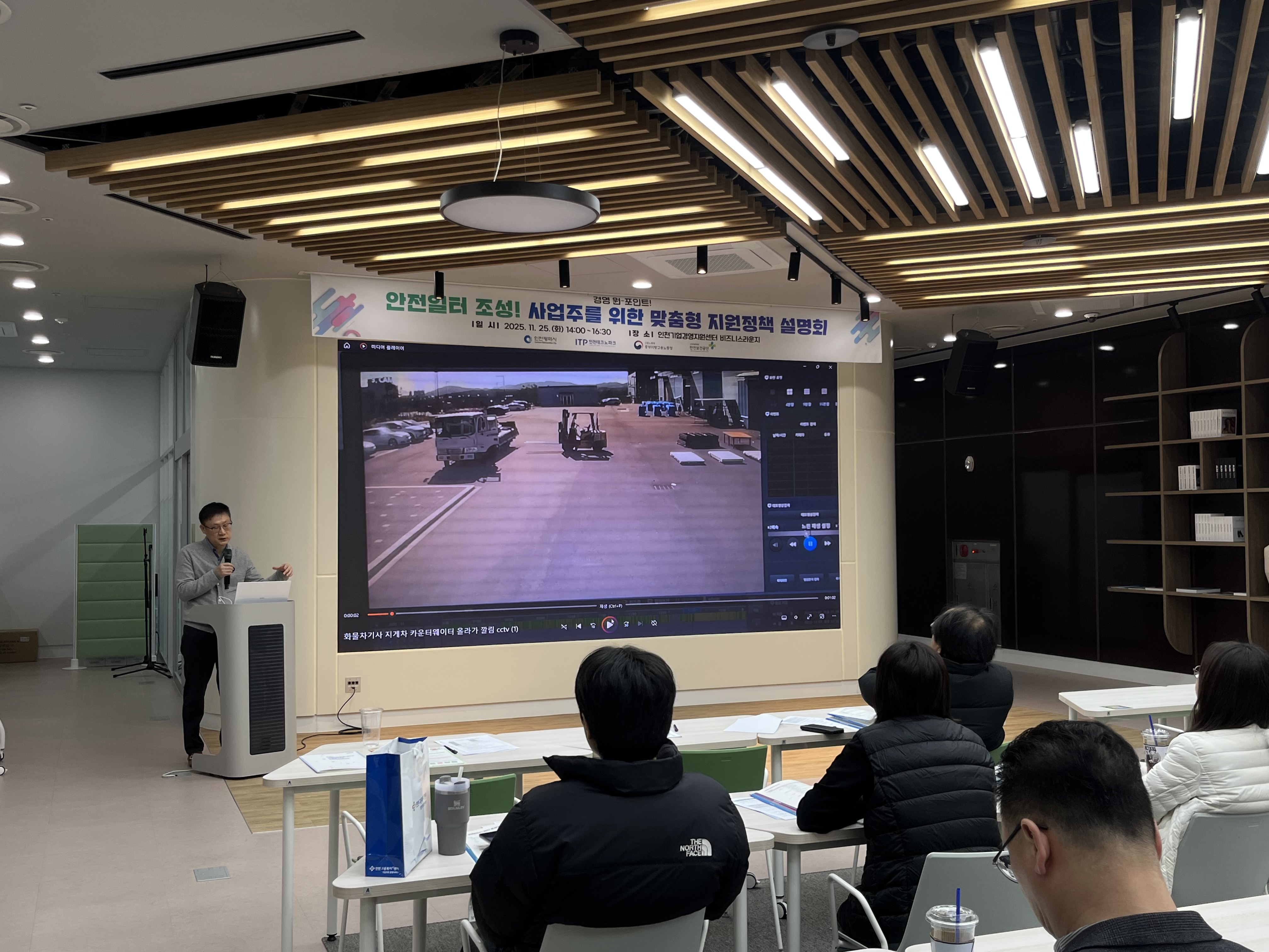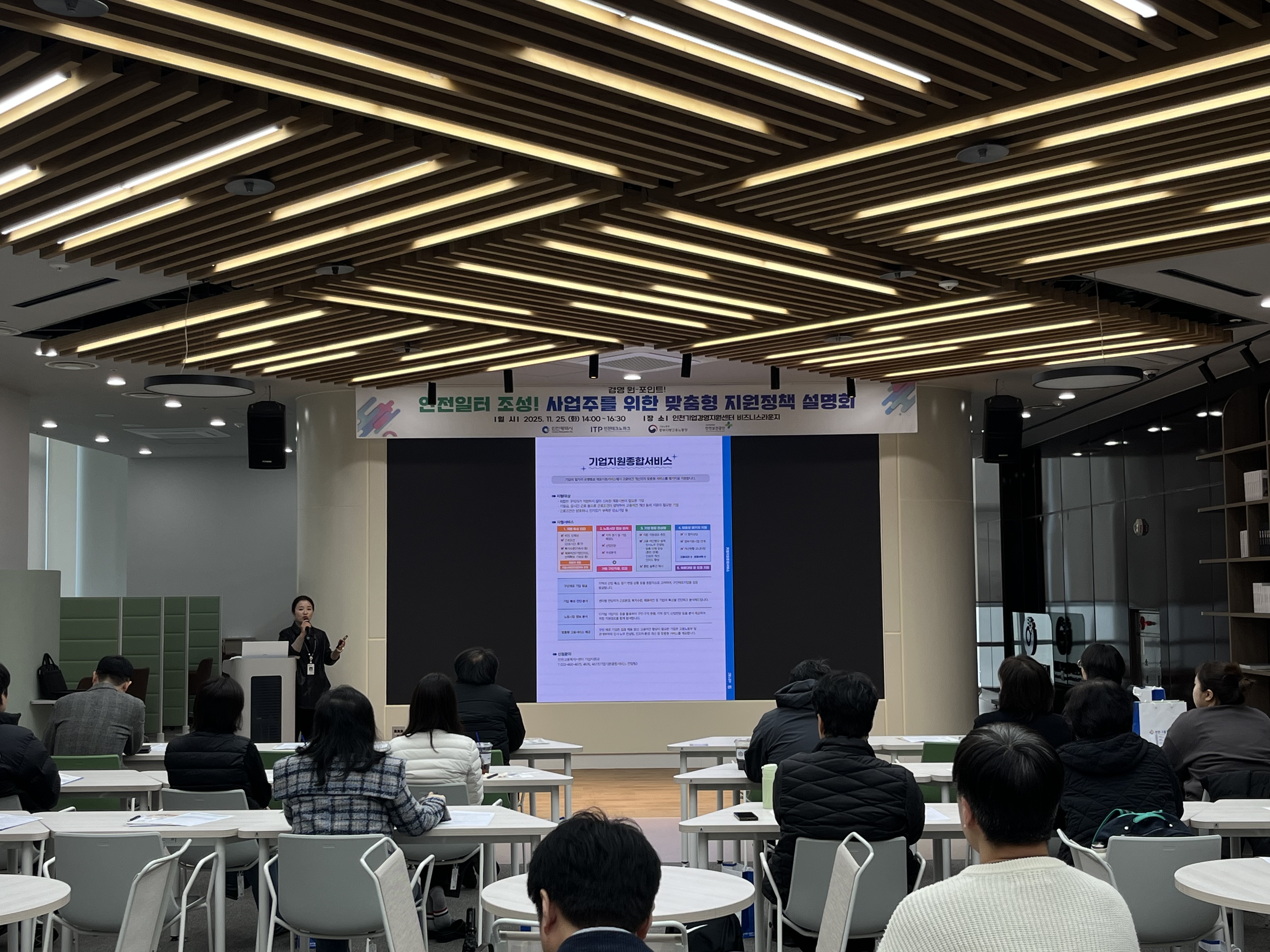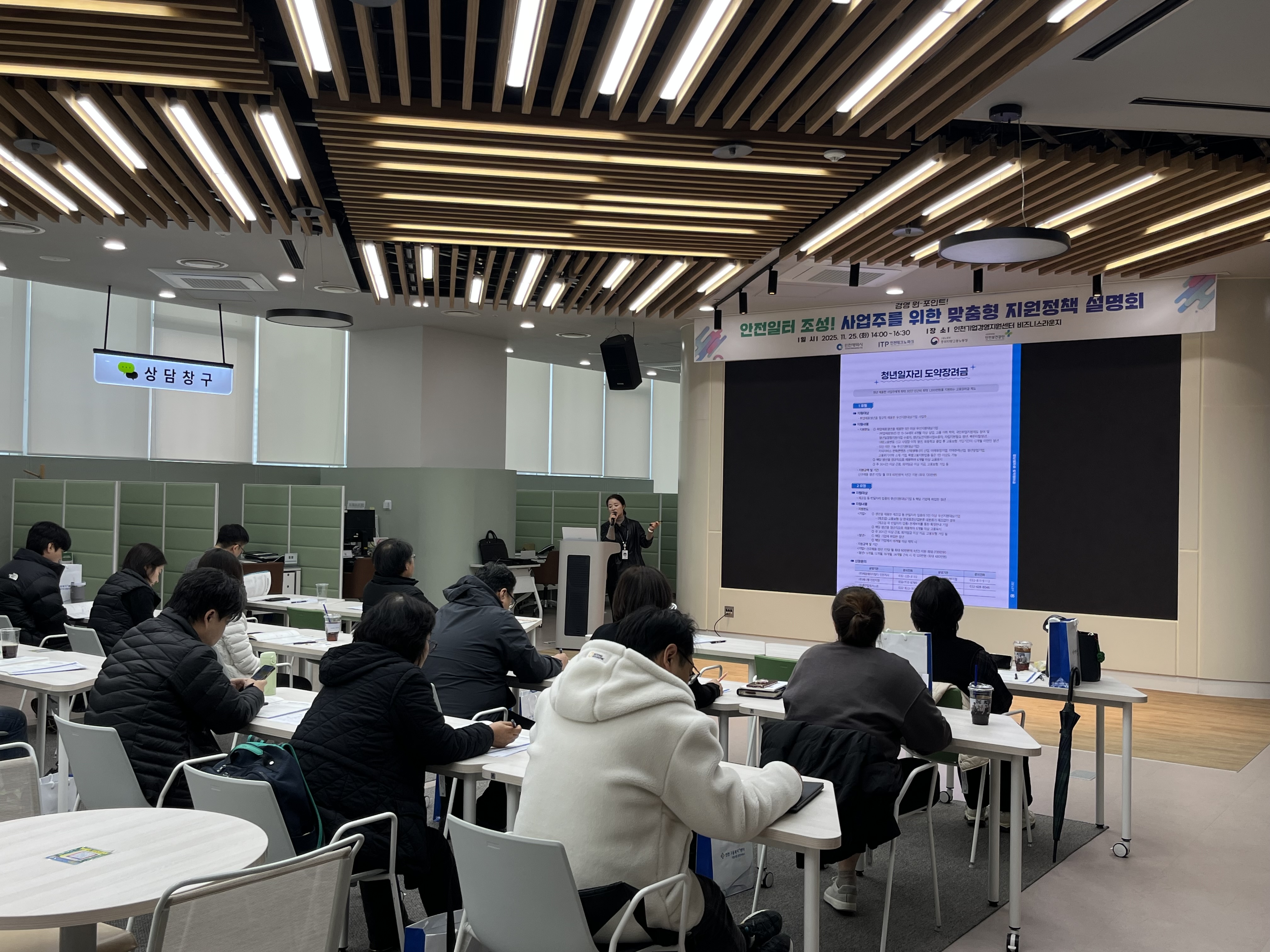 2025년 11월 25일, 인천기업경영지원센터 비즈니스 라운지에서 안전일터 조성! 사업주 맞춤형 지원정책 설명회가 진행되었습니다.
